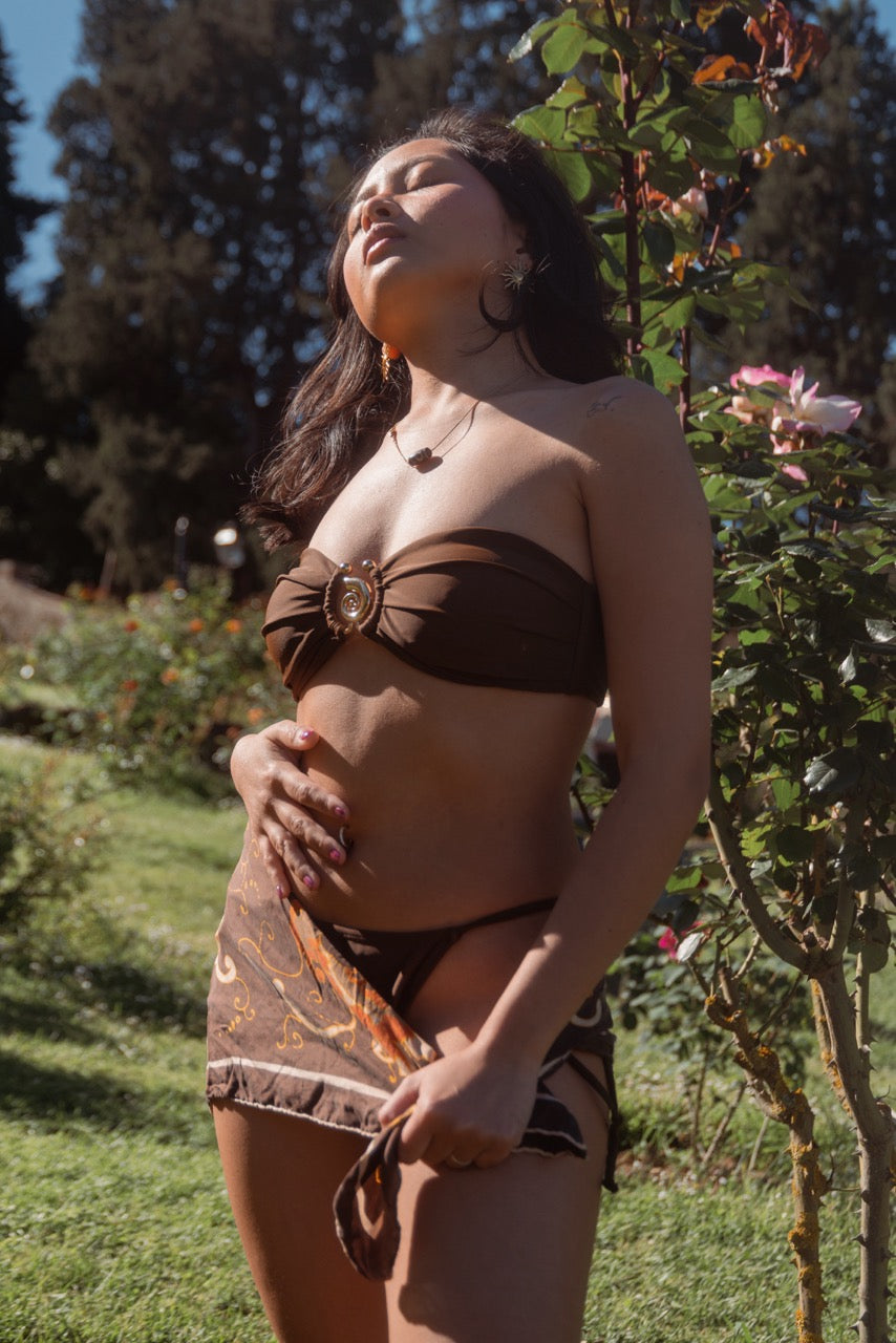 Renata is our strapless bikini designed for a sleek, sophisticated silhouette. Featuring a bandeau style top adorned with a golden spiral shell centerpiece, this suit brings a sense of organic luxury to your swimwear collection.